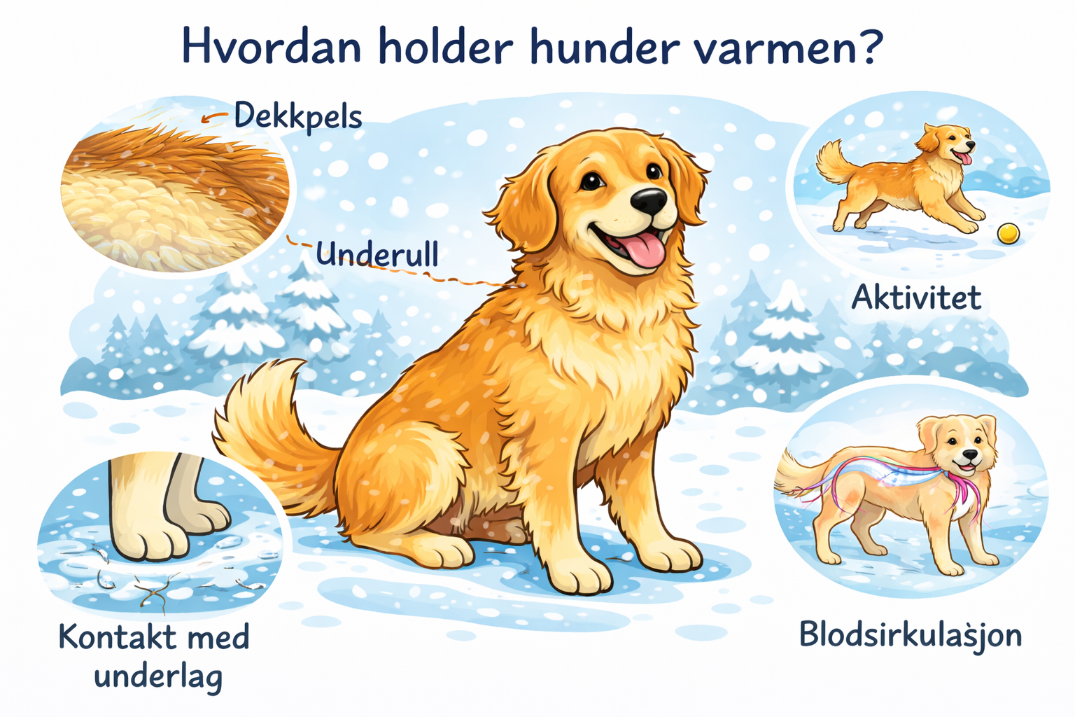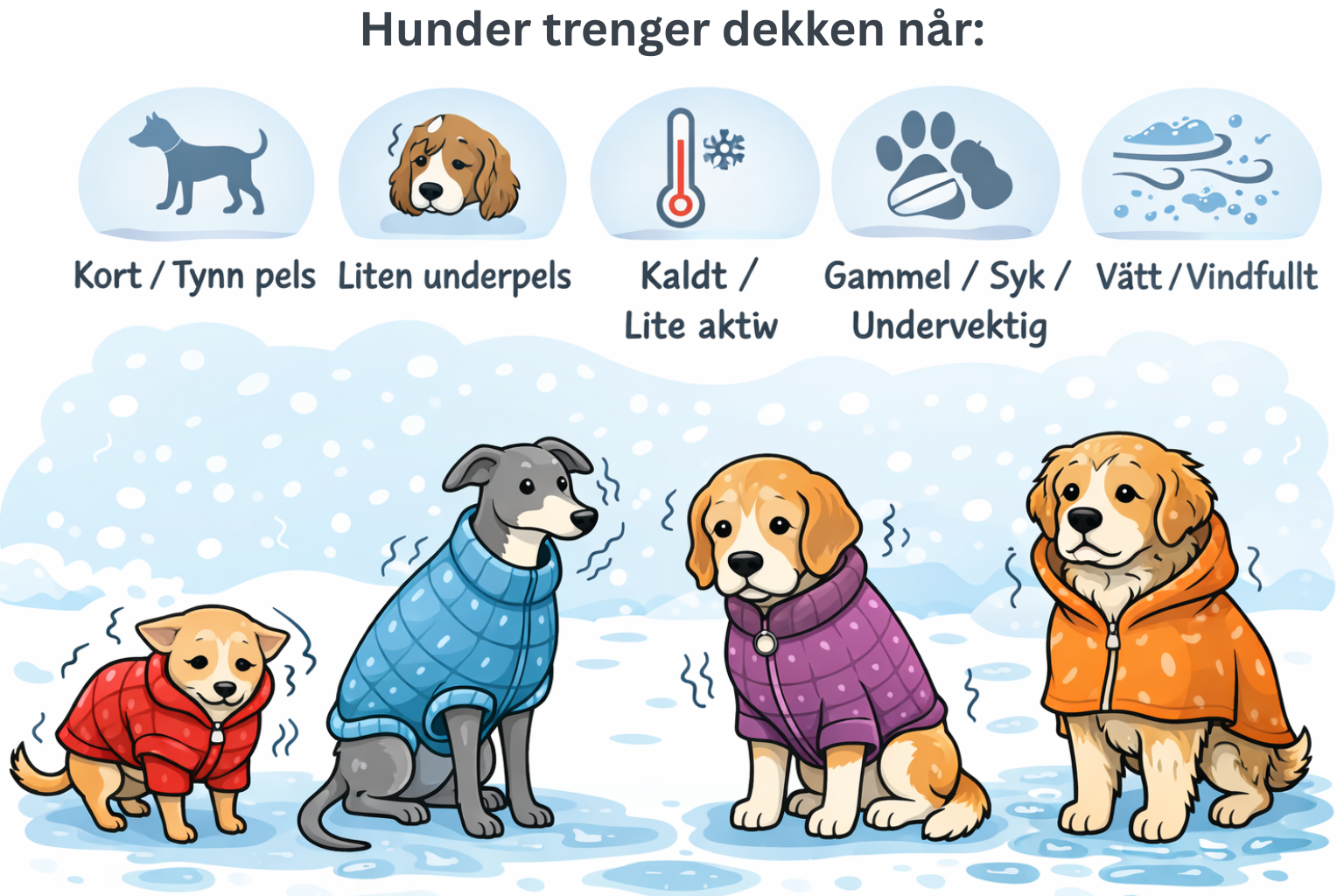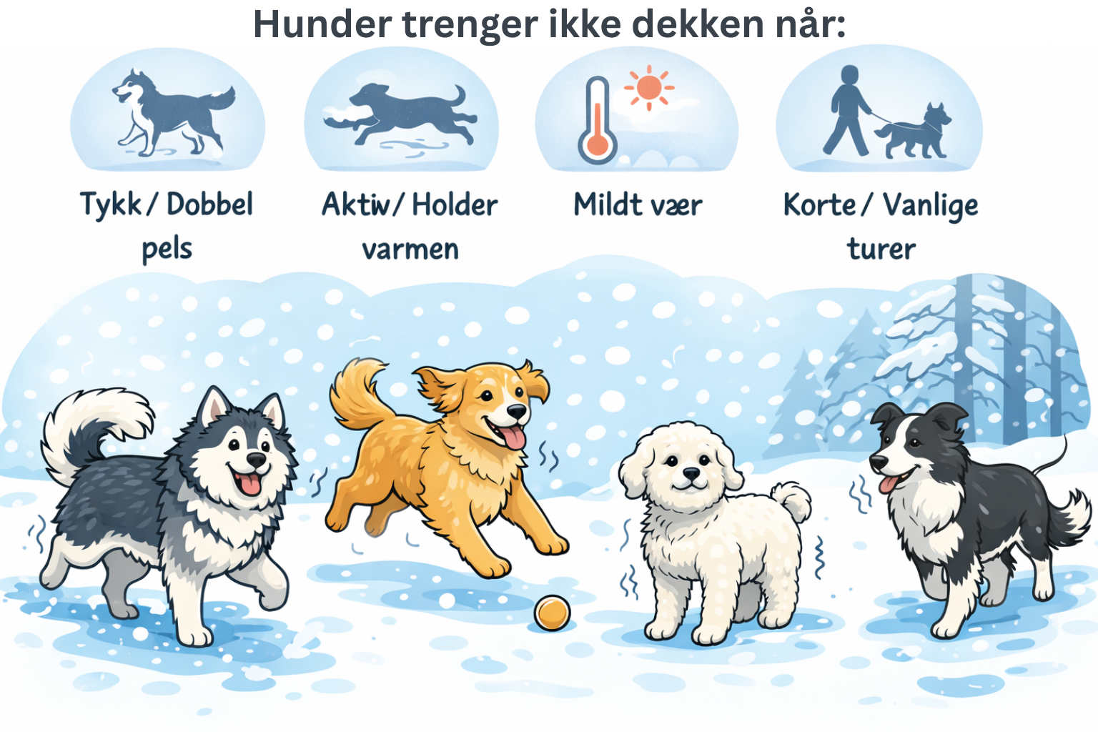 Samtidig er det viktig å huske at selv en tykk pels ikke gjør hunden immun mot kulde. Vått vær, vind, lite aktivitet eller høy alder kan gjøre at også slike hunder fryser.